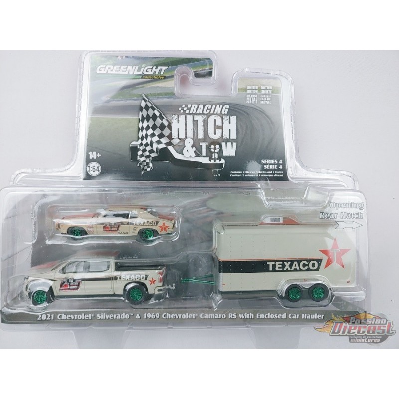 GreenMachine 2021 Chevrolet Silverado and 1969 Chevrolet Camaro RS - on Flatbed Trailer - Texaco - 1/64 Greenlight - 31140 CGR