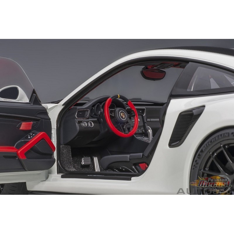 High quality miniature scaled in 1:18 distributed by the company AUTOart. With the inviting painting, in other this collectible item is a highlight in every display The "AUTOart Porsche 911 (991.2) GT2 RS Weissach Package (White) 1:18 "78171" is known as a favored street car.