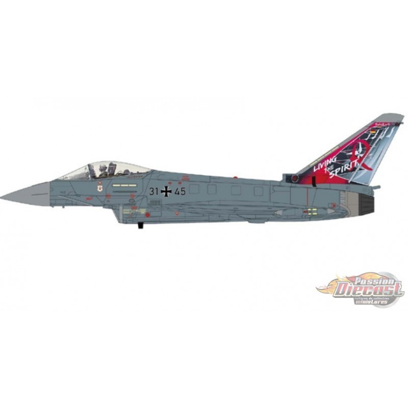 On December 9, 2002 the first German Air Force Eurofighter was accepted at Manching. The Luftwaffe didn't use the name "Typhoon" because some proposed WWII anti-aircraft missiles were called Taifun (Typhoon in English). Eurofighter 31+45 c/n GS0105 was given a special paint scheme to mark the merging of TaktLwG71 "Richthofen" and TaktLwG73 "Steinhoff" at Air Force Base Laage. The usual home base for TaktLwG71is Wittmund but upgrading this base caused the merger. The aircraft was flown by Commodore Oberst Ramspott. The paint scheme motto is "Living The Spirit".