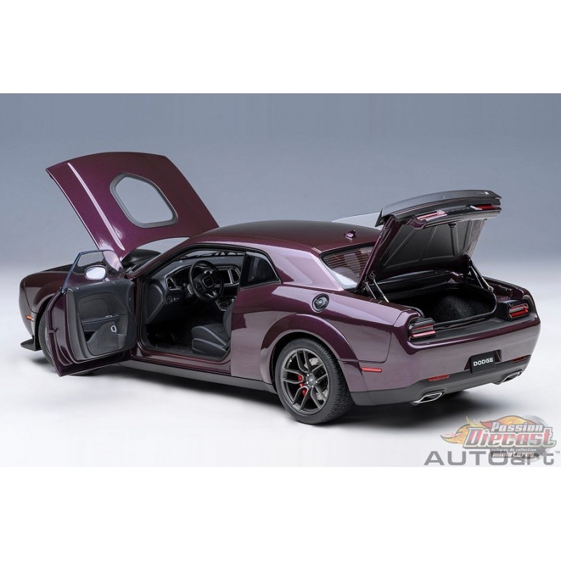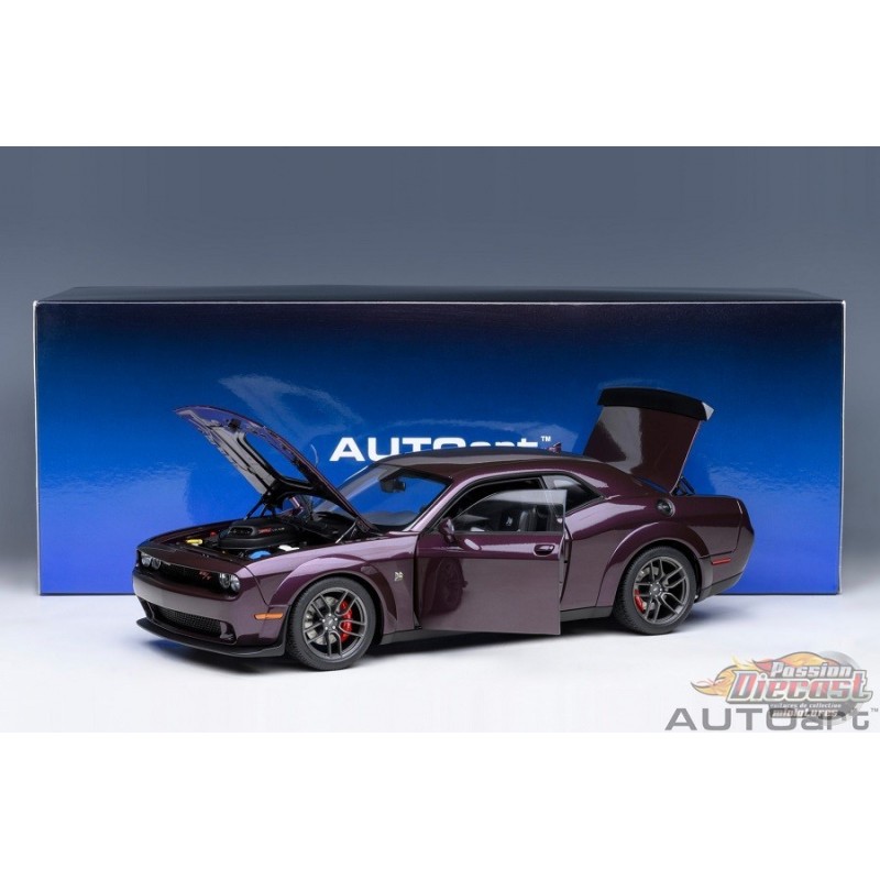 High quality miniature scaled in 1:18 distributed by the company AUTOart. With the inviting painting, in other this collectible item is a highlight in every display The "AUTOart Dodge Challenger R/T Scat Pack Shaker Widebody 2022 (Hellraisin) 1:18 "71771" is known as a favored street car.