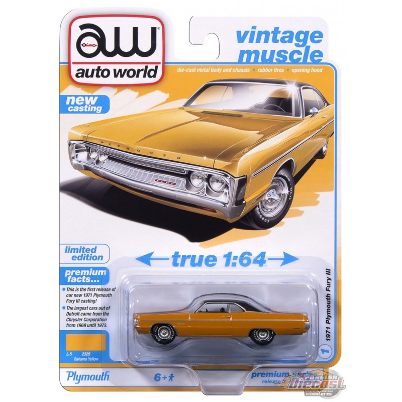 (Preorder) Plymouth Fury III 1971 Jaune Bahama - 2025 Premium Release 3 Version A - Auto World - 1/64 -AWSP204 A