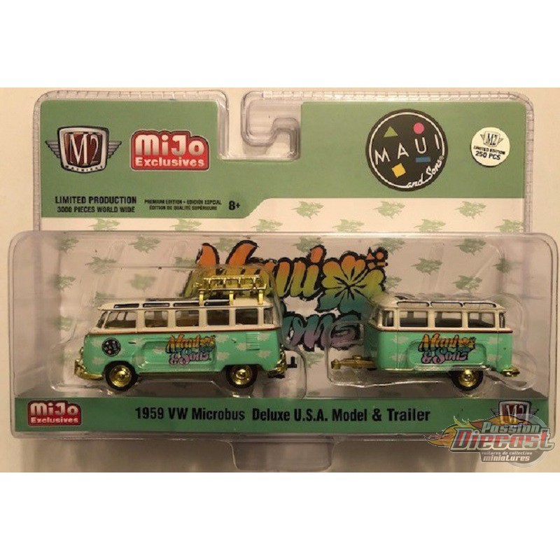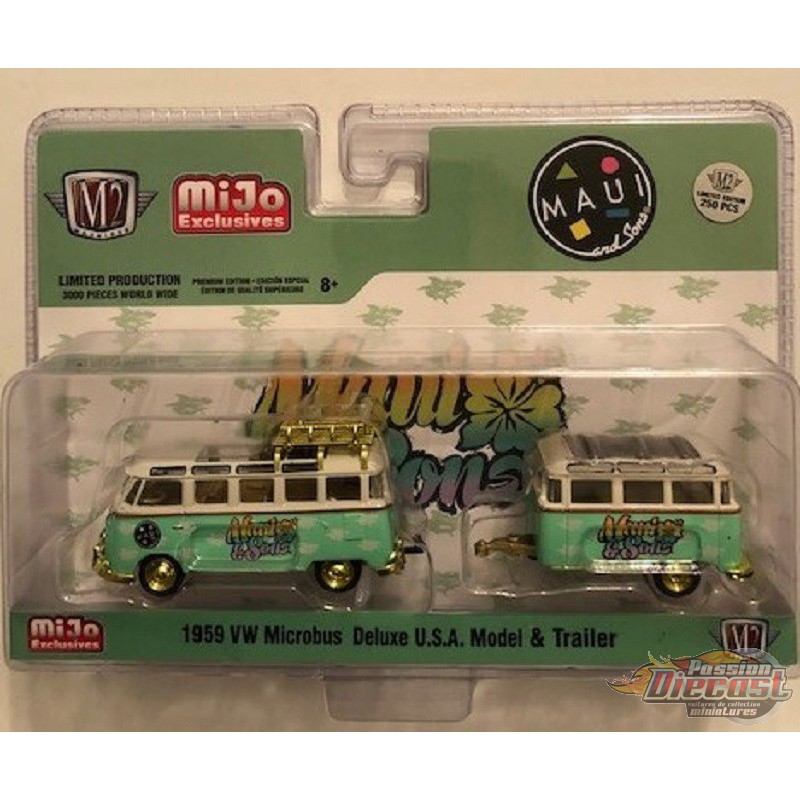 Volkswagen Bus Deluxe avec remorque Maui & Sons - SUPER CHASE CAR M2 Machines 1/64 - 38100 MJS02GR