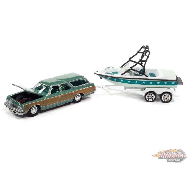 1973 Chevy Caprice Woody Wagon en vert avec bateau Mastercraft et remorque - Johnny Lightning 1:64 - JLBT015 - JLSP204 A