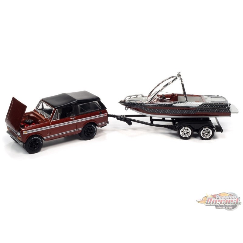(web only)1969 International Scout II en rouge et noir avec Malibu Boat et remorque - Johnny Lightning 1:64 JLSP205 A