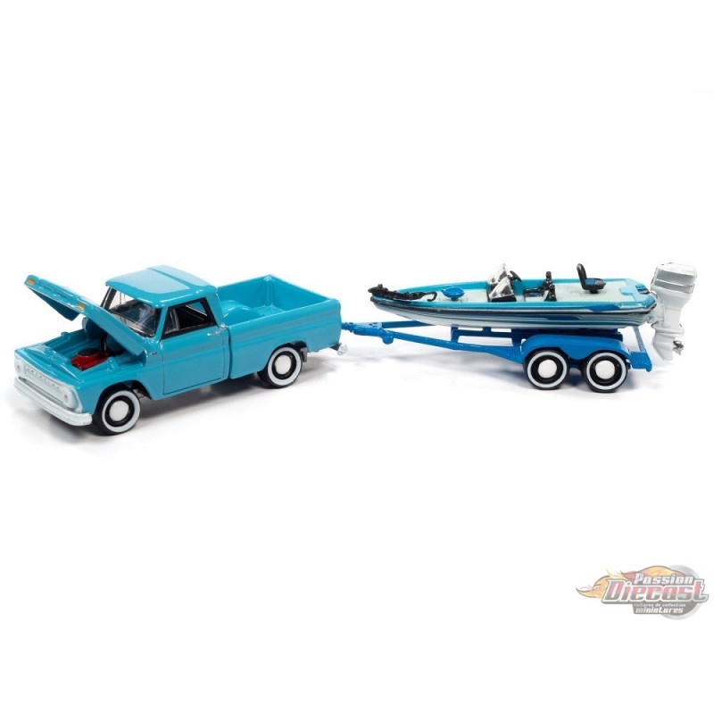 (web only)1965 Chevy Stepside Pickup Turquoise, Bleu et Blanc avec Bass Boat et Remorque - Johnny Lightning 1:64 JLSP203 B
