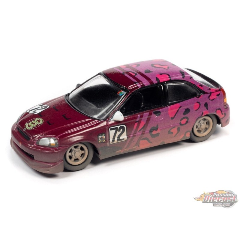 • Honda Civic 1998 en magenta métallisé avec imprimé léopard fuchsia et effet poussière de route - 24 heures de citrons