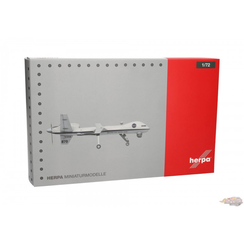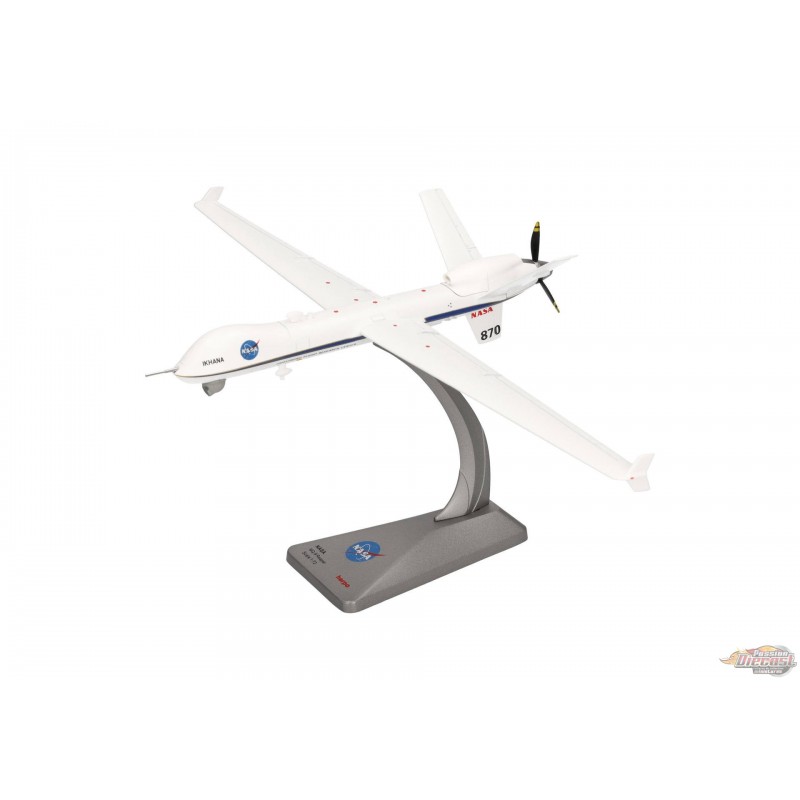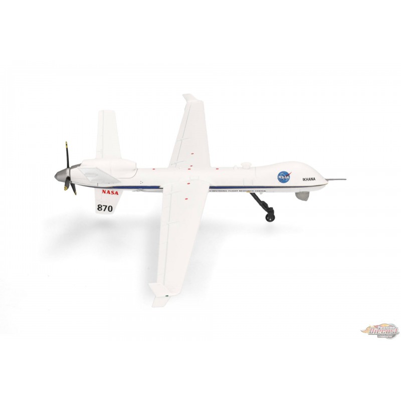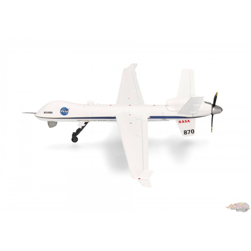 Le MQ-9 est un véhicule aérien sans pilote (UAV) télécommandé. Il est piloté par un équipage de deux personnes depuis une station au sol. Grâce à son moteur turbopropulseur unique de 900 ch, le MQ-9 peut atteindre une vitesse maximale de 480 km/h (300 mph), tandis que ses 1 800 kg (4 000 lb) de carburant lui confèrent une autonomie de 1 900 km (1 200 mi). Ce MQ-9 a été baptisé « Ikhana » par la NASA. Ce nom vient de la langue amérindienne choctaw et signifie « intelligent, conscient, attentif », ce qui convient parfaitement à un avion utilisé pour la recherche et les essais de nouveaux systèmes avancés d'observation, de collecte de données et d'opérations autonomes de drones. En plus d'avoir été utilisé pour de nombreux projets scientifiques depuis son acquisition en 2006, « Ikhana » a été sollicité pour surveiller les incendies de forêt et soutenir les déploiements des pompiers dans toute la Californie. Ce modèle réduit en métal moulé sous pression à l'échelle 1/72 peut être exposé sur son train d'atterrissage ou en vol avec le train d'atterrissage rentré. Deux jeux de train d'atterrissage et un socle d'exposition sont inclus.