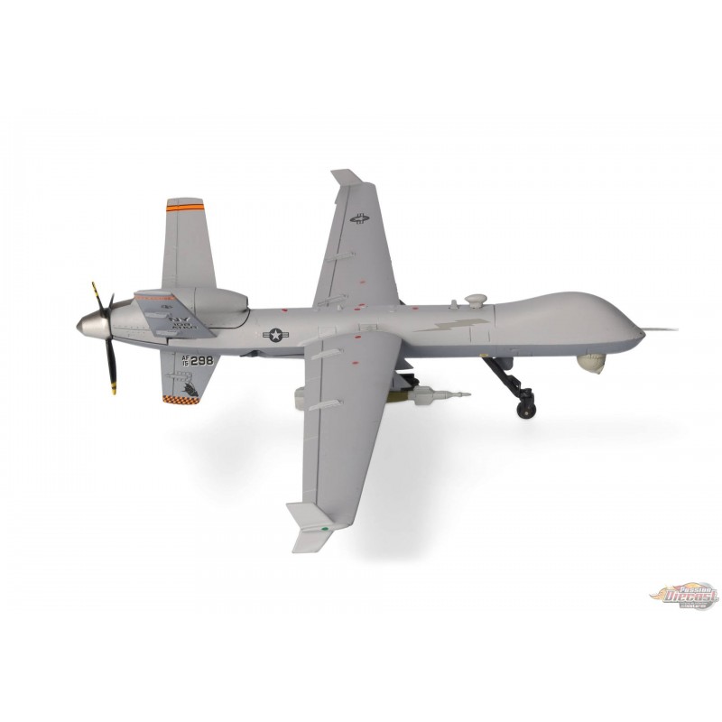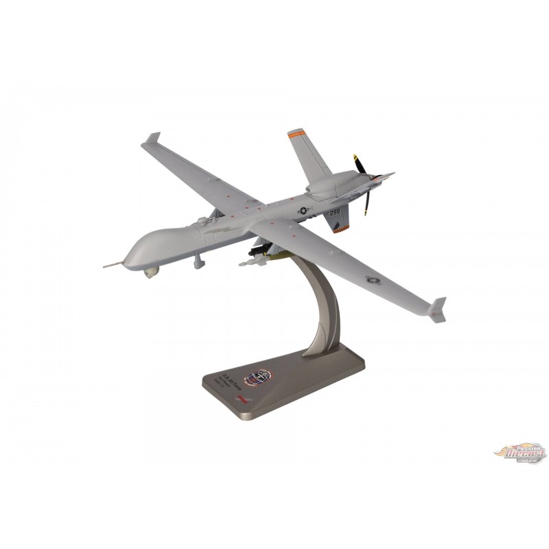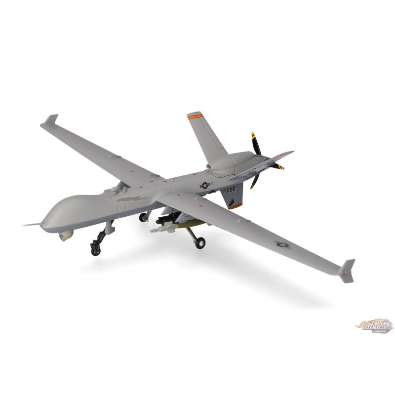 Le MQ-9 Reaper est un drone télécommandé (UAV). Il est piloté par un équipage de deux personnes depuis une station au sol. Contrairement aux drones précédents, qui étaient principalement utilisés pour la surveillance et la reconnaissance, le Reaper est le premier drone conçu comme une plateforme d'attaque. Grâce à son moteur turbopropulseur unique de 900 ch, le MQ-9 peut atteindre une vitesse maximale de 480 km/h (300 mph), tandis que ses 1 800 kg (4 000 lb) de carburant lui confèrent une autonomie de 1 900 km (1 200 mi). Il dispose de quatre points d'emport sous son envergure de 20 mètres (65 pieds) pour accueillir toute une gamme d'armements, tels que le missile air-sol Hellfire ou des bombes guidées par laser. En 2007, l'armée de l'air américaine a pris livraison du premier des plus de 300 Reapers commandés. En raison de l'usure et du retrait des anciens appareils, environ 220 MQ-9 sont actuellement en service dans plus de 20 escadrons, dont onze unités de la Garde nationale aérienne. Le 108e escadron d'attaque, basé à Syracuse, fait partie de la Garde nationale aérienne de New York et est chargé de former les équipages des MQ-9 pour l'armée de l'air américaine et la Garde nationale aérienne. Ce modèle en métal moulé sous pression à l'échelle 1/72 peut être exposé sur son train d'atterrissage ou en vol avec le train d'atterrissage rentré. Deux jeux de trains d'atterrissage et un socle d'exposition sont inclus.
